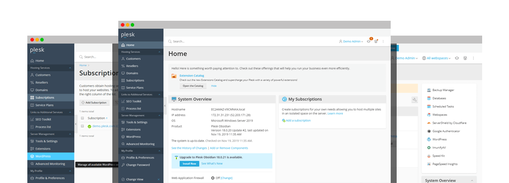 cPanel is a Linux®️-based one of the most loved and popular web hosting control panel and is only available for Linux operating system. It also has a simplified process for hosting websites. It allows you to navigate between multiple features, making it very easy to use even for beginners. Domains, DNS Zone Editor, Subdomains, Aliases, Email Accounts, File Manager, FTP Accounts, SSL/TLS, MultiPHP INI Editor, Cron Jobs, ModSecurity, Hotlink Protection, IP Blocker, Security Policy, Directory Privacy, Disk Usage, Backup, Git™ Version Control, phpMyAdmin, MySQL and PostgreSQL Databases in just a few clicks , you can monitor server performance. There are also many third-party apps and tools to improve your productivity such as Softaculous.