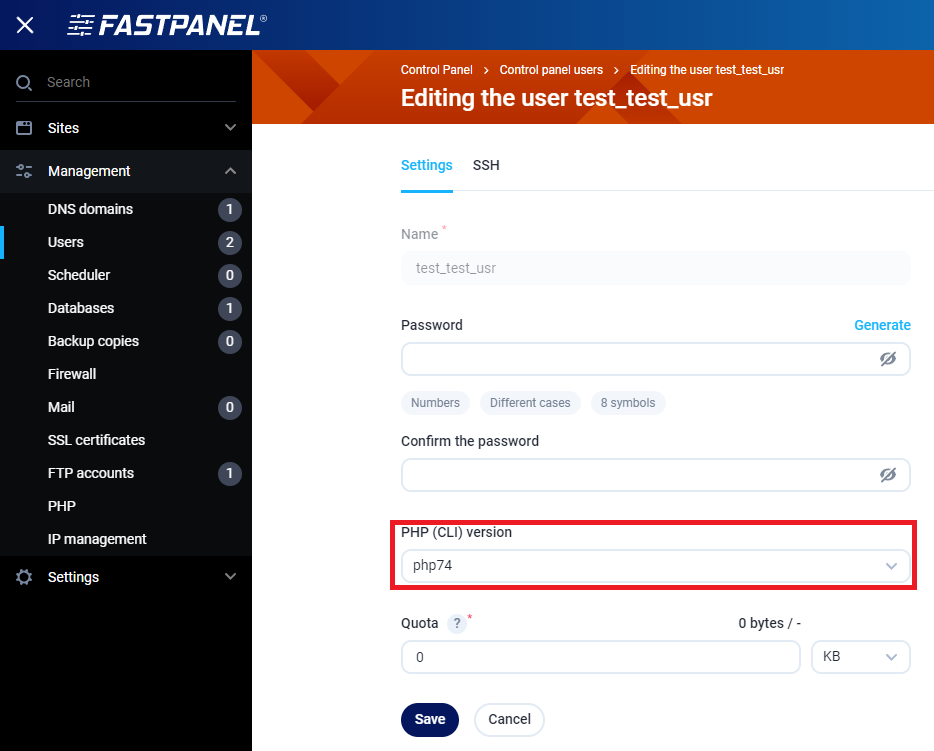 FASTPANEL Menu > Management > Users > PHP (CLI) Version > Save