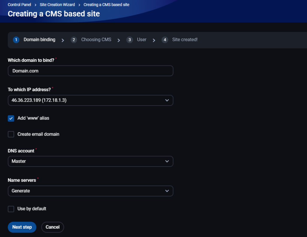 After that, Enter the domain name in “Which domain to bind” field, check “Create email domain” if you want to enable email for your domain, DNS as Master and Nameservers “generate” or you can use existing
