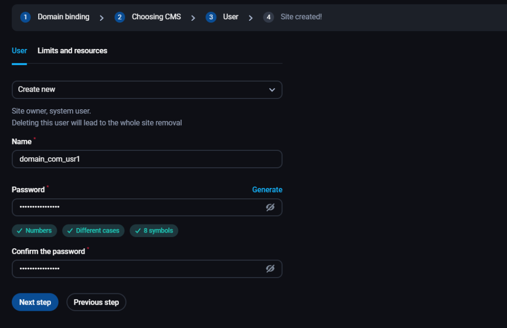 On user step, you can create new user or use existing user, login username and password are added by default, you can save them or you can enter custom one and you can set user limit and resources (eg, site, database, etc.) After that, click on “Next Step”