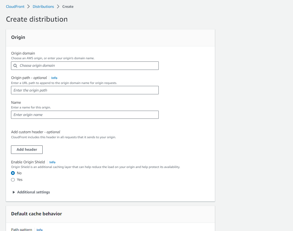 In the distribution settings screen, configure the necessary settings for your CloudFront distribution. Enter the origin domain name, which can be an Amazon S3 bucket, an EC2 instance, or a custom origin server. Choose whether to enable HTTP or HTTPS support and specify the default root object if needed.