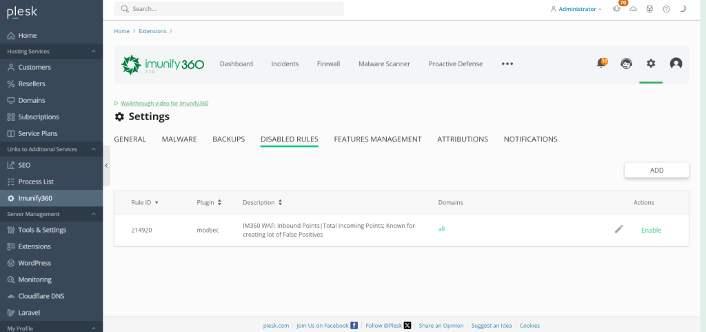 Configuring General Settings: Imunify360 -> Settings -> Disabled Rules