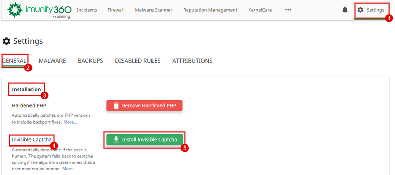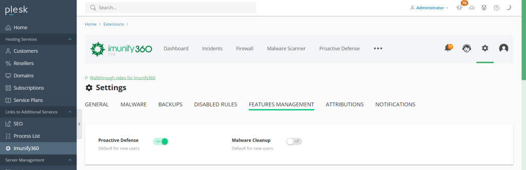 Configuring General Settings: Imunify360 -> Settings -> Features Management