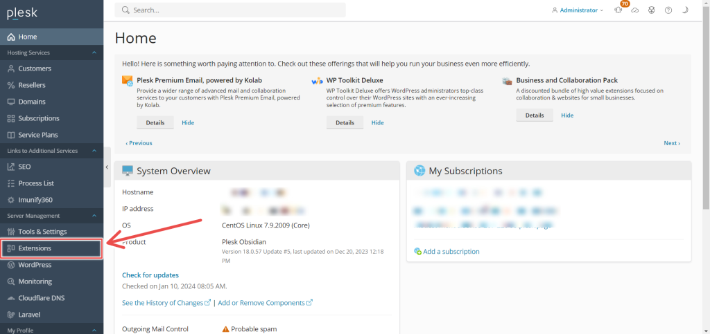 Within Plesk, locate and click on “Extensions” in the left-hand menu. This will open the Extensions Catalog.