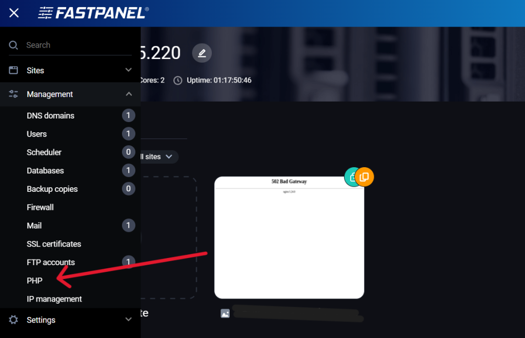 After login to the FASTPANEL, click on the menu icon, then click on PHP under Management. (Menu > Management > PHP) (refer the following image)